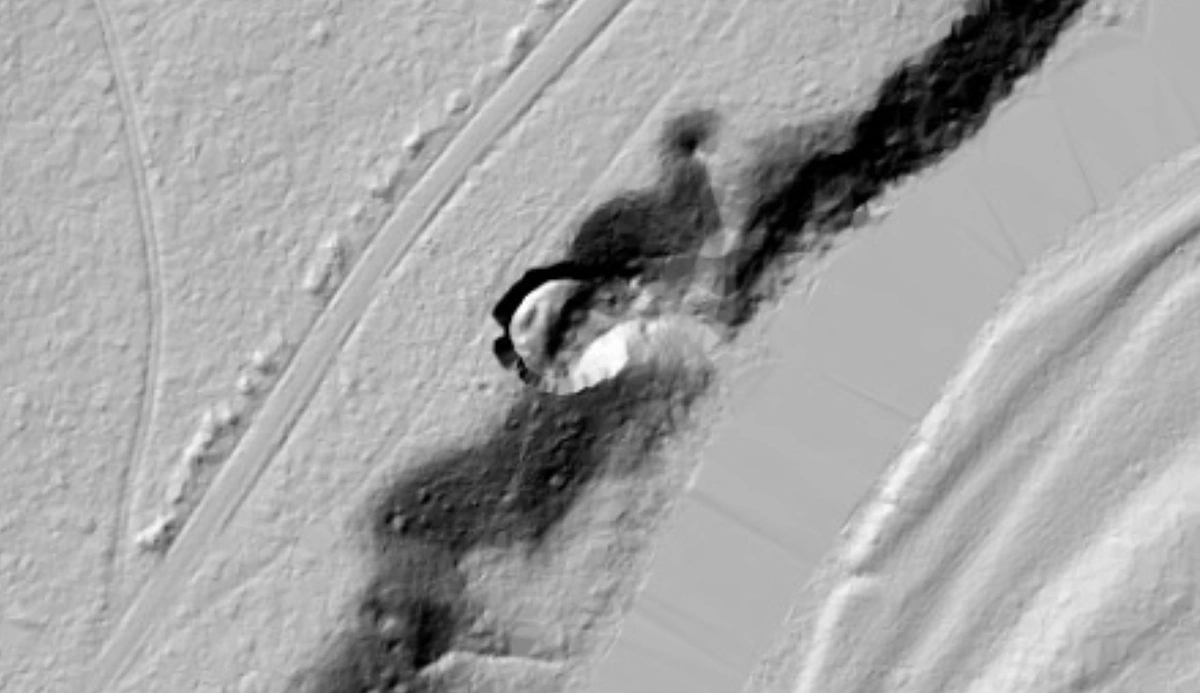 Govs ala – pārsteidzoši precīza apļa formas iegruvums Salacas kreisajā krastā. / Digitālais reljefa modelis, Latvijas ģeotelpiskās informācijas aģentūra.