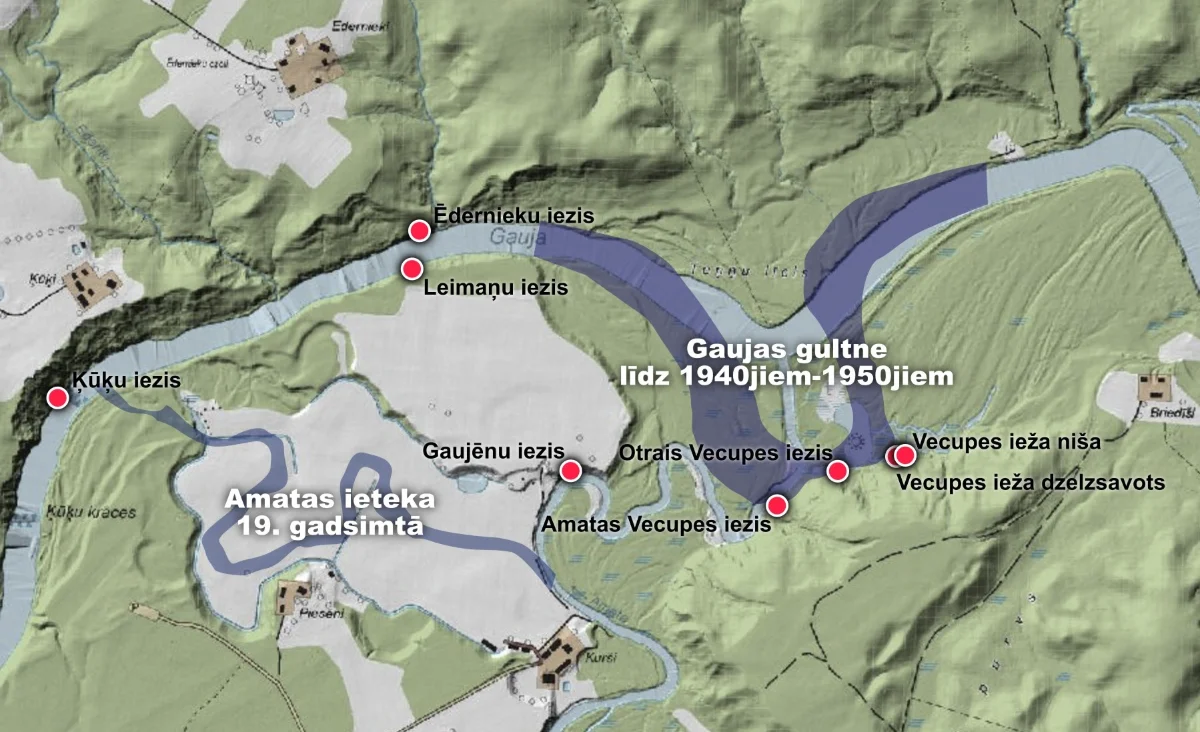 Netālu no Amatas ietekas Gaujā atrodas divas klintis – Amatas Vecupes iezis un vēl viens iezis, ko šeit sauksim: otrais Vecupes iezis. Šo klinti vēl salīdzinoši nesen apskaloja Gauja.